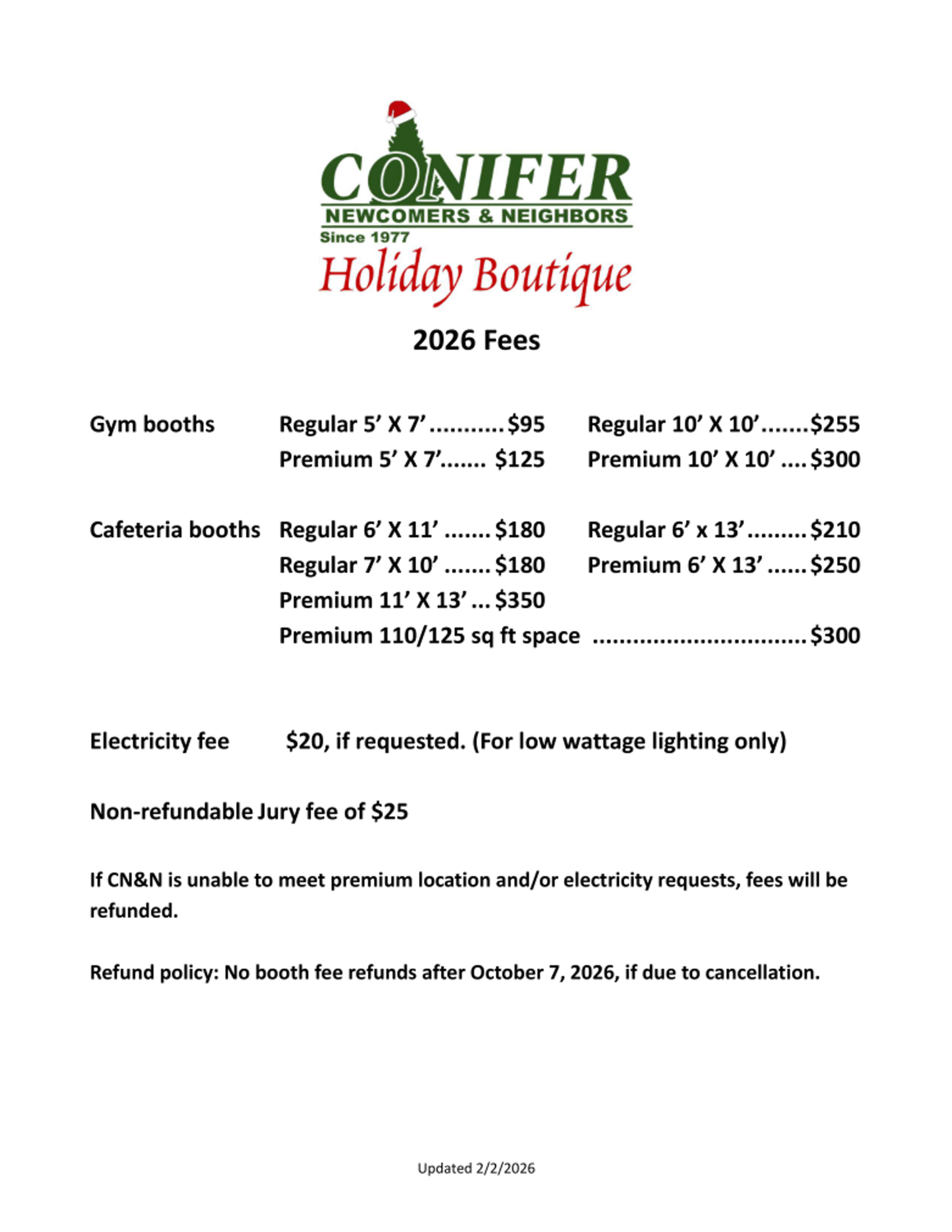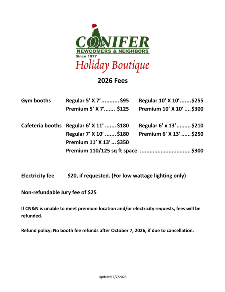 Conifer Newcomers & Neighbors Artisan Information Thank You for a Wonderful 2025 Boutique Saturday, November 8, 2025 Second Saturday in November 9 am to 4 pm Conifer High School What returning Artisans have to say “I was Impressed by the high quality of the show”—Cindy Kuck, Metal Sculptor Want to be considered for the 2026 Holiday Boutique, please contact us Contact the Boutique Committee